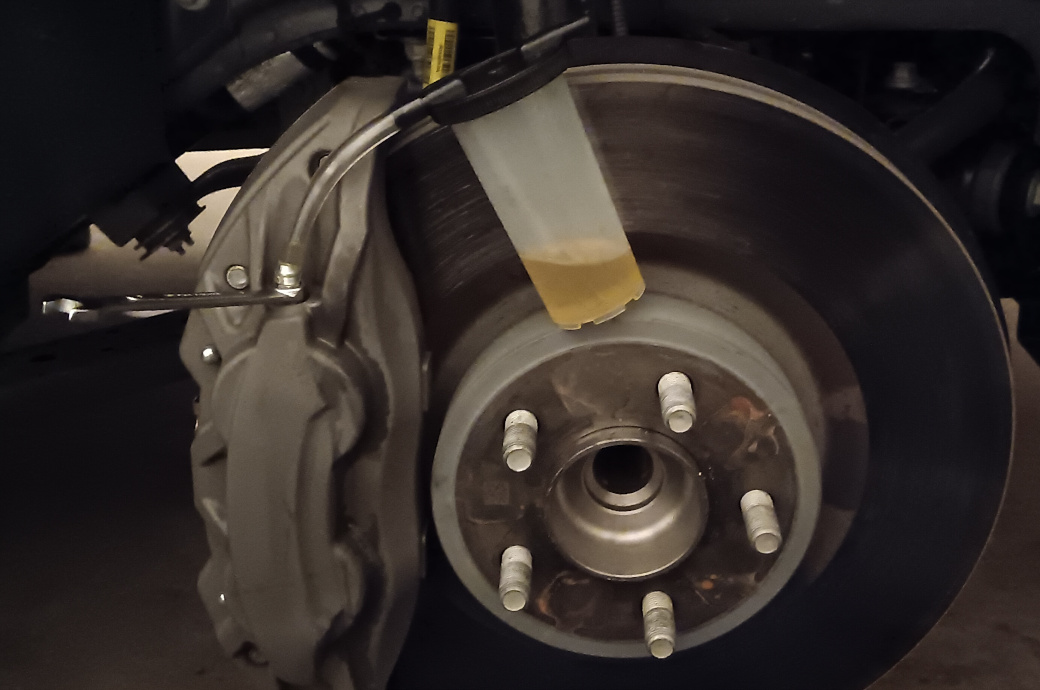 Use Hand Brake pump to create positive pressure on the braking system. Use 8mm wrenches for front brakes and 10mm wrenches for the back brakes. Use a little brake fluid in the vacuum brake drain reservoir.