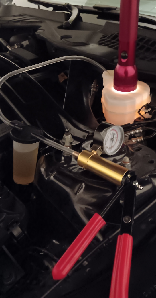 To create positive prossure on the braking system, attach the brake hand pump to the brake reservoir. Make sure to add about a half bottle of braking fluid to the hand pump's bottle. Pump the handle until the system achieves 20psi of gage pressure.